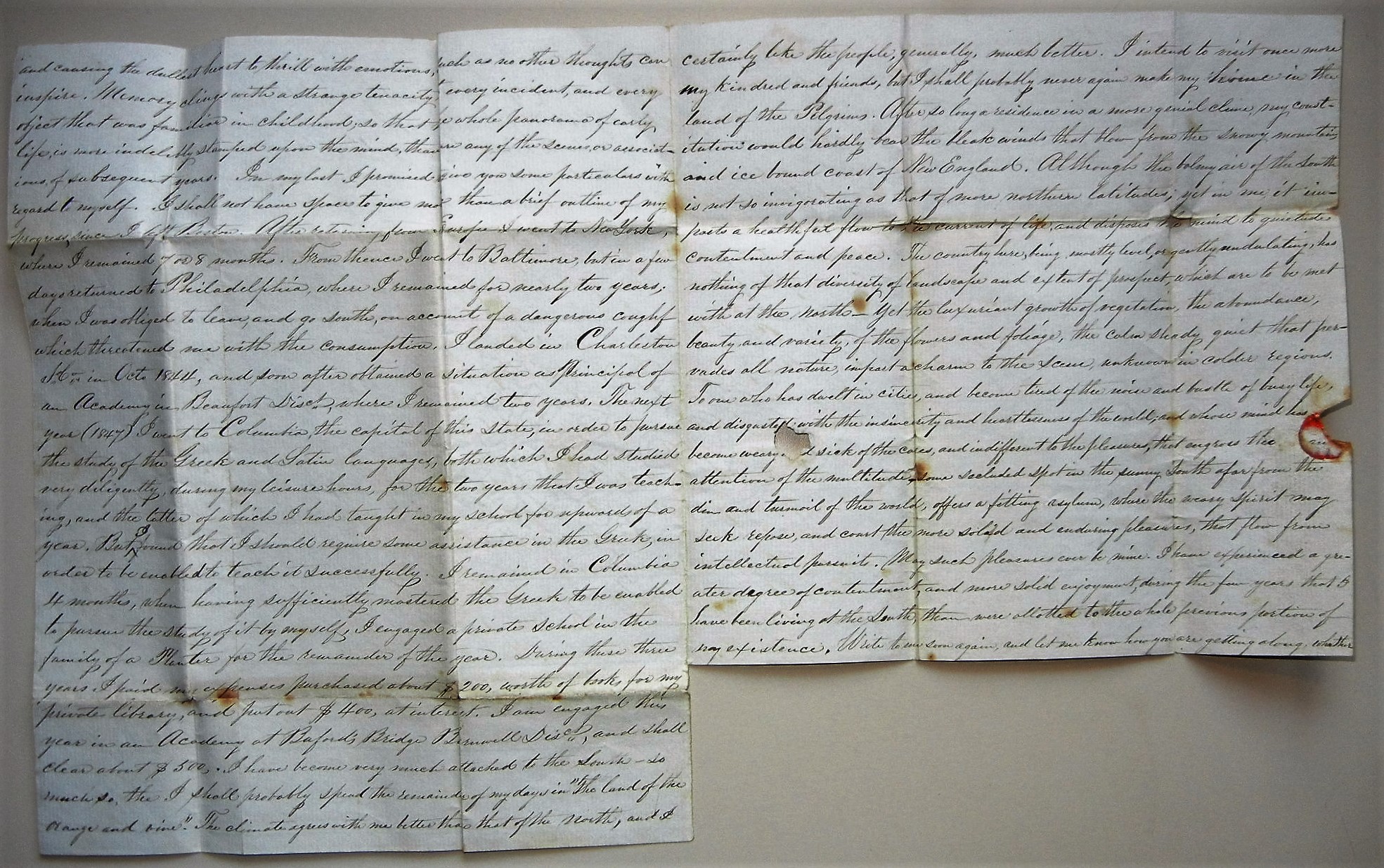 Addressed to Mr. Joseph Scribner, the three-page letter is from his brother lamenting the passing of their father and that the writer was unable to return home before the parent passed. In the letter, he describes his travels and teaching positions he has held, including a lucrative position at the private school of a planter. "During these three years, I paid my expenses, purchased about $200 worth of books for my private library, and put out $400 at interest." He was also employed at the Academy of Buford's Bridge "and shall clear about $500". He loves the South and plans to spend the rest of his days there. He does intend to visit New England but "After so long a residence in a more genial clime, my constitution would hardly bear the bleak winds that flow from the snowy mountains and ice bound coast of New England. Well written and easy reading. Letter shows some wear and it appears a small portion at the bottom of page three has been clipped off.