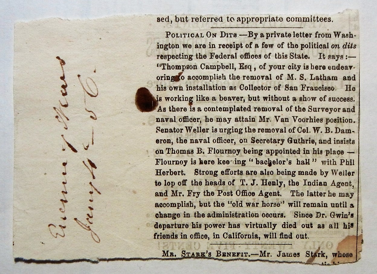 Postmark is full, sharp and rare. Item sent FREE to Washington DC indicating political sender. Cannot decipher recipient's name, but clipping inside is of political nature and note at side of cover says See Webber about McAllister. Clipping from Evening News January 4, 1856. Since this postmark was first used in 1856, the could be an earliest known use cover. Cover has stain upper left that goes into postmark.