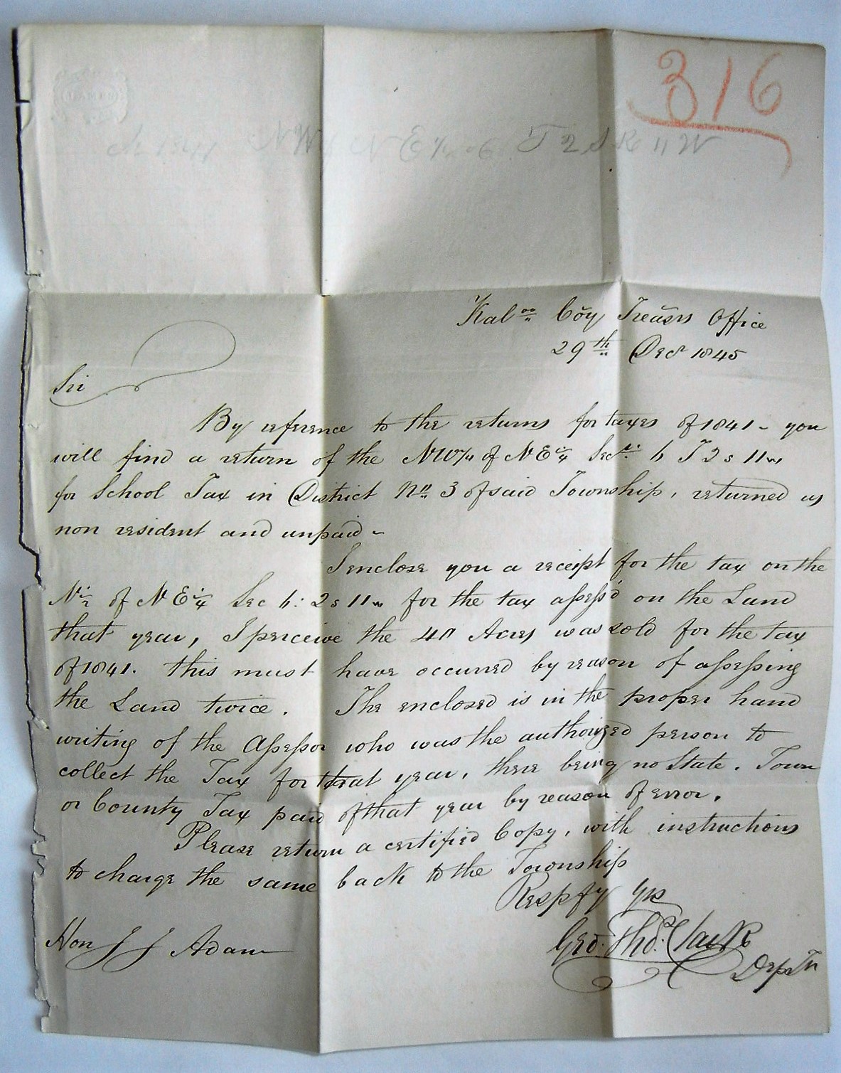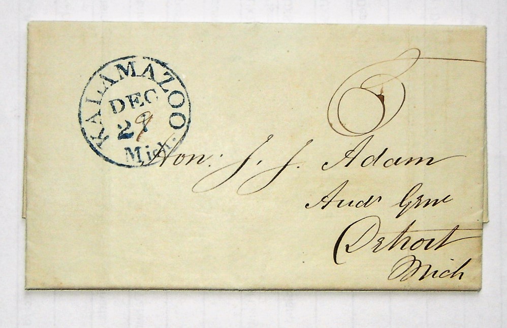 Beautiful full Klamazoo Michigan blue strike on this stampless folded letter. Note is from Kaloo Treasurer's Office regarding tax payments and refunds. Veery attractive.