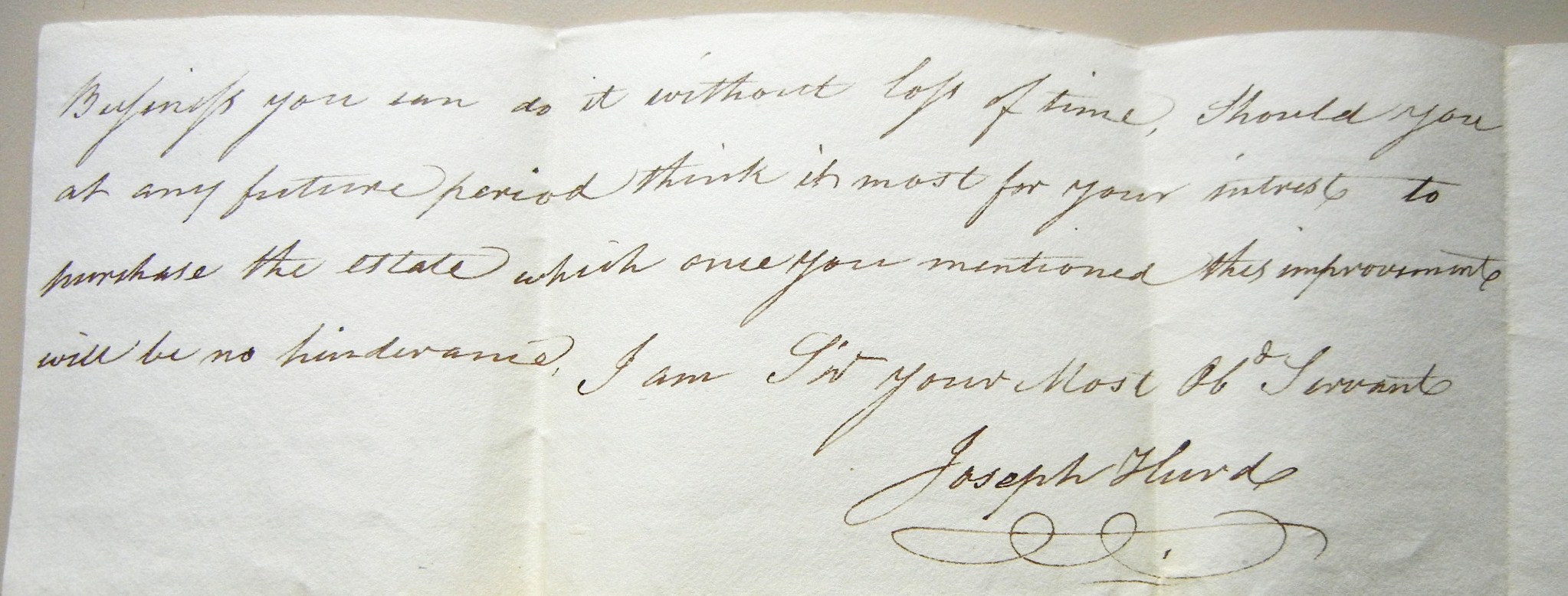 Red Portsmo postmark. SFL in very good condition.  Letter is from a property owner to William Shepherd, tennant, who wanted some upgrades.  Joseph Hurd, owner, doesn't want to do the work out of fear the tennant will move before the cost is recouped.  Minor separations at top fold.