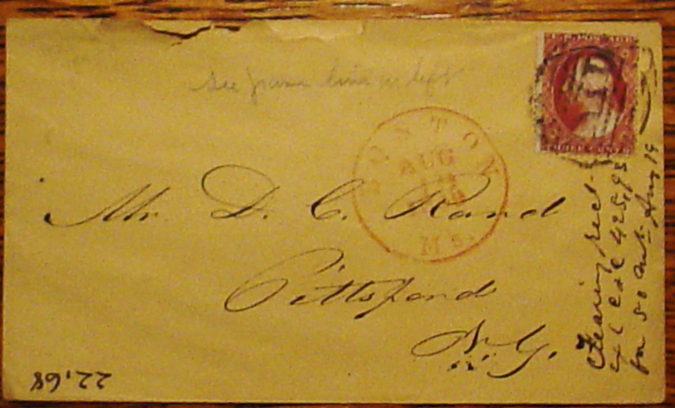 Nice cover. Full paid cancel goes with what looks like August 19, 1859 Boston red postmark. Also, there is partial double frame line at left.