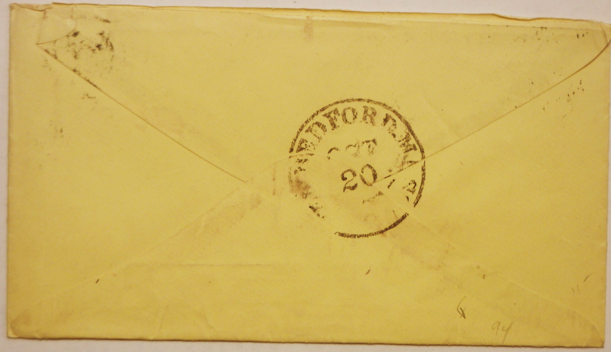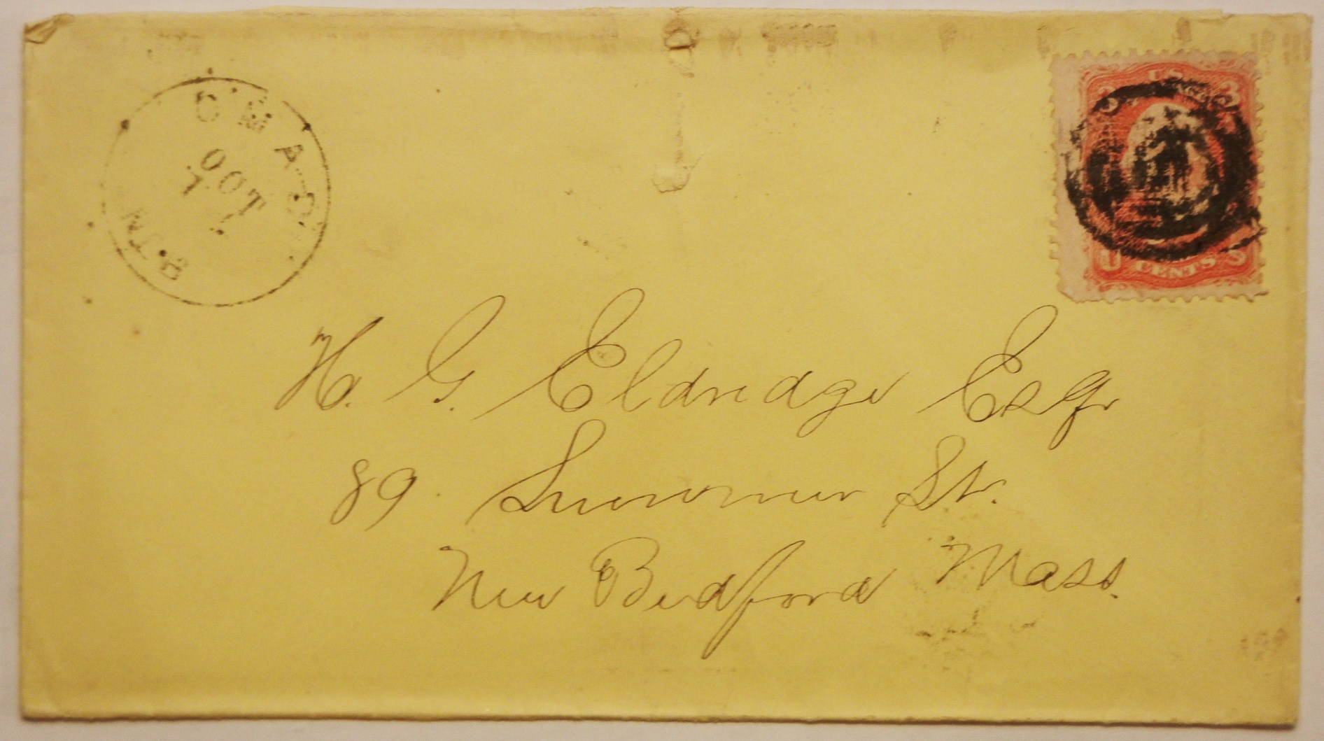 Cover in good condition for its age. Bullseye fancy cancel on grilled stamp. Light Omaha postmark and almost full New Bedford receiver on the back.