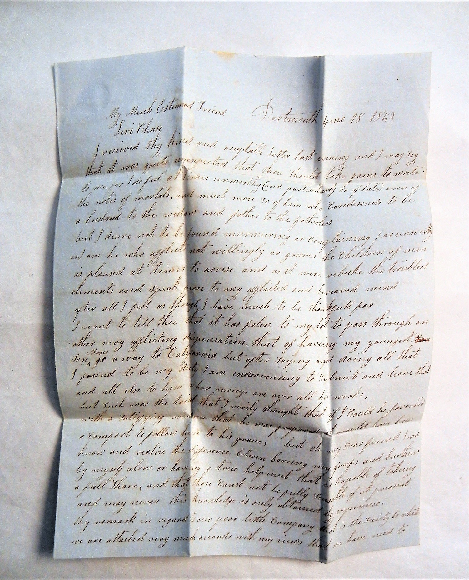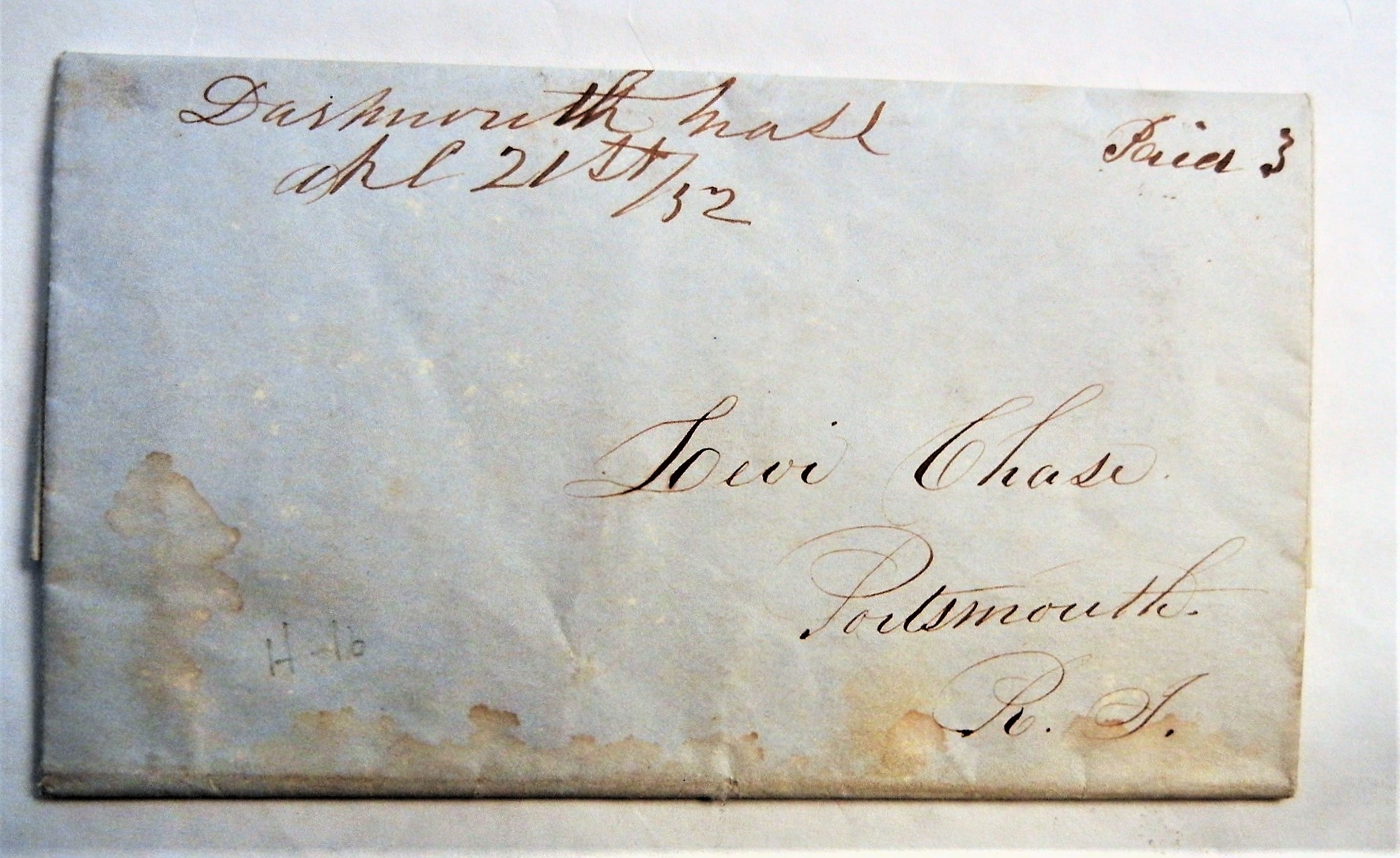Vintage stampless folded letter mailed from Dartmouth, Massachusetts. Addressed to Levi Chase, Portsmouth, NH. Letter is dated and written in the Quaker style. Paper has second sheet edge tear where seal broken (usual). Transcription follows:
