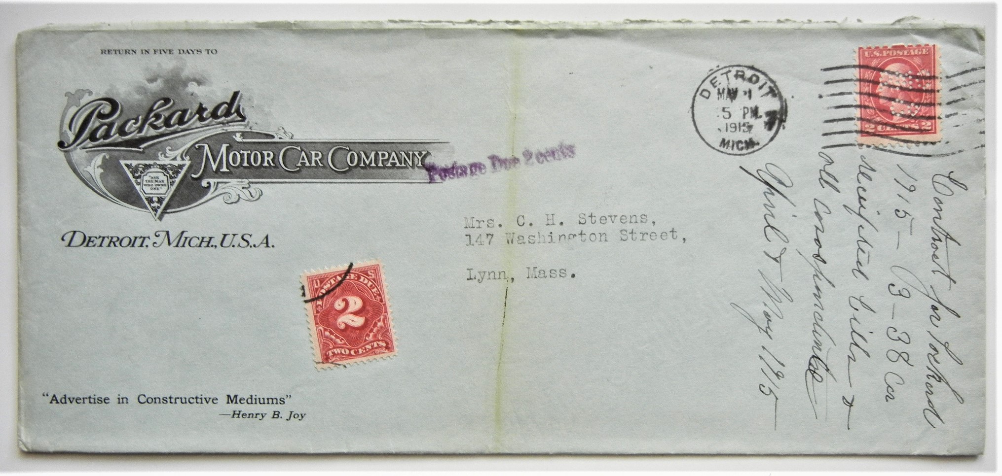 Good cover with excellent artwork, PMC CO perfin stamp, auxiliary mark of Postage Due 2 cents along with pre-cancelled postage due stamp.