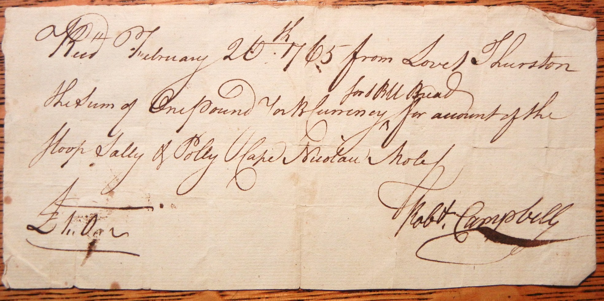 Campbell was a very interesting captain. This is a pre-Revolutionary War 1765 acknowledging receipt from Lovet Thurston in the sum of one pound for bread carried on his Sloop Sally. Suitable for framinging Here is an additional account on his adventures from the American Archives: