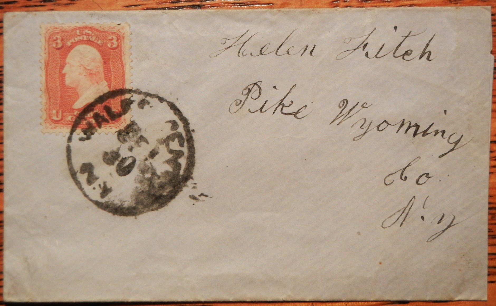 Small blue cover with well-centered Scott #65 stamp. Small community. Covers from this time period are scarce. Excellent condition. Addressed to Helen Fitch in Pike Wyoming.