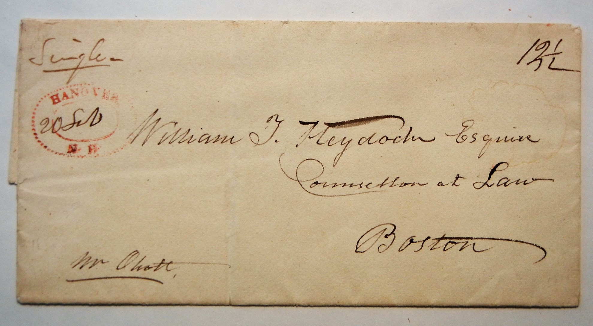 Dotted oval postmark is almost complete. 12.5 rate for distance to Boston. No content.