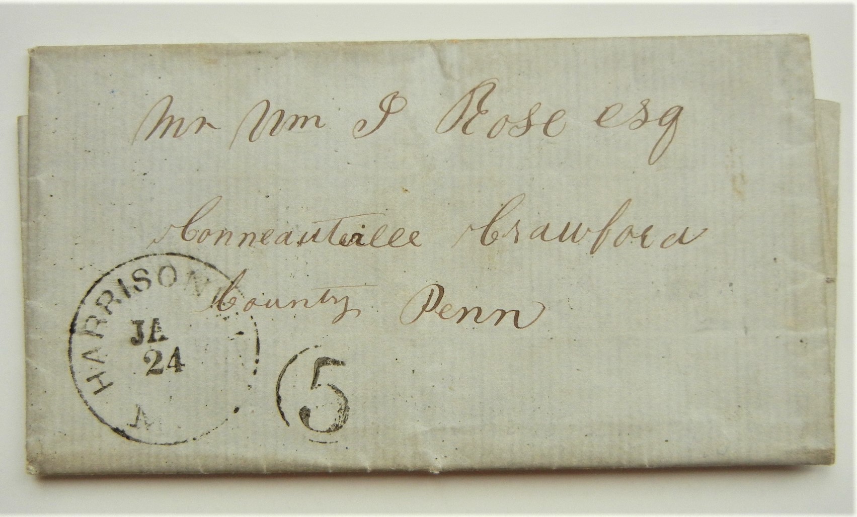 Desirable Harrisonville postmark along with circle 5 rate (unlisted in ASCC). Interesting letter that starts with the usual health and sickness updates and moves into business. "Stock high and in great demand. There will be a heavy emmigration (sic) across the plains this season, a great deal of stock to match. I am fearful for feed to be plentiful. A good many families are going."