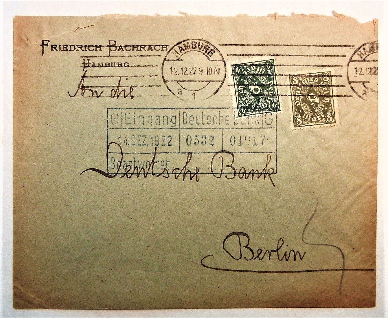 Good lot of six early Germany postal history covers including advertising for Stadt-Sparkasse, Friedrich Bachrach, Wilhelm Kleine Hulsewische, and Proskauer & Pauson. Nice array of early stamps and stamp combinations.