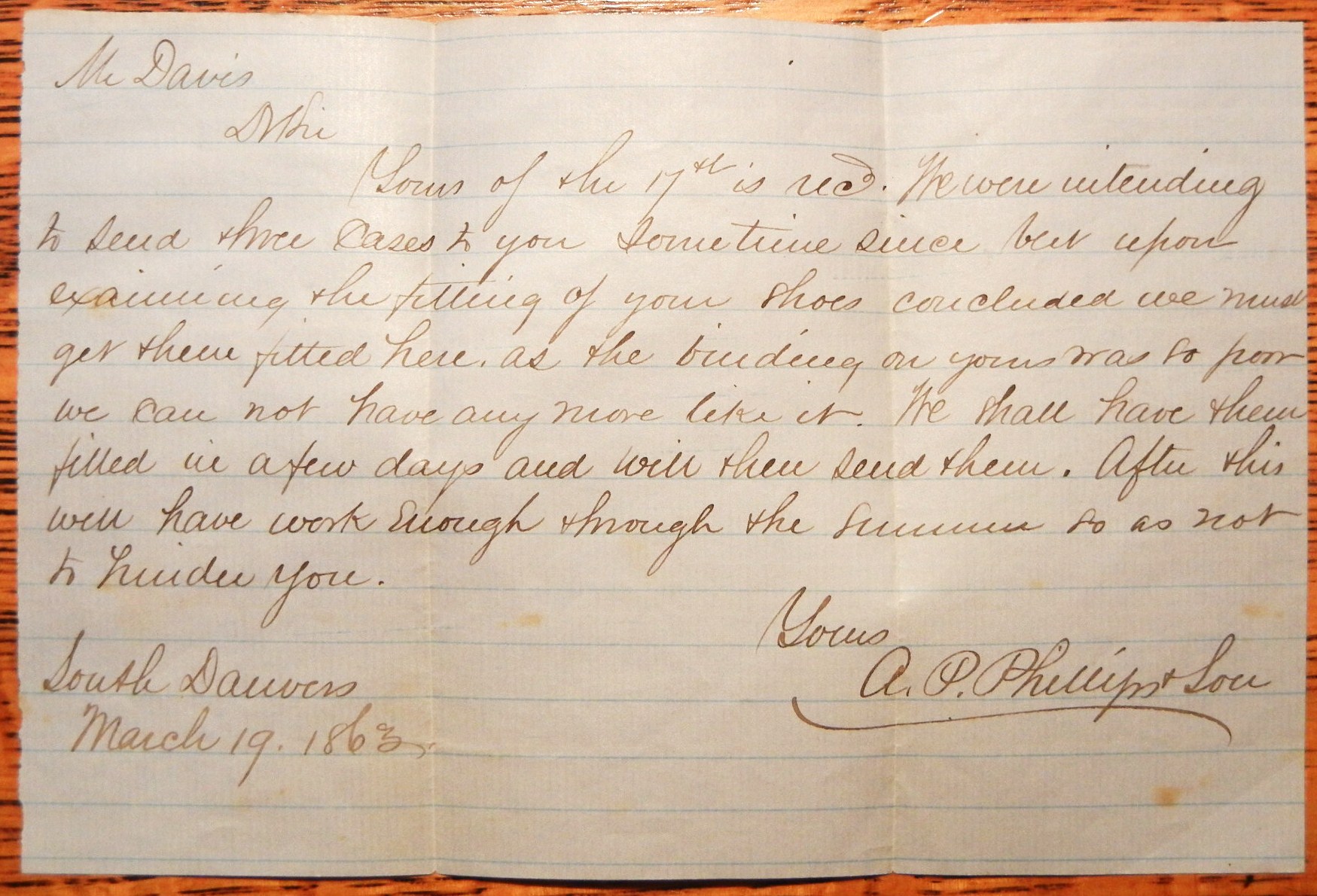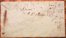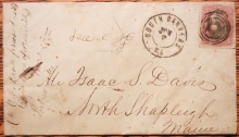 Full double-ring South Danvers, MS, postmark on this cover along with cog-wheel in circles fancy cancel. Business letter from A. P. Phillips & Son (well known shoemakers in the center of Danvers) to Isaac Davis, South Shapleigh, Maine regarding problems with a recent order. "we were intending to send three cases to you sometime since, but upon examining the fitting of your shoes concluded we must get them fitted here as the binding on yours was so poor we can not have any more like it. We shall have them filled in a few days and will then send them."