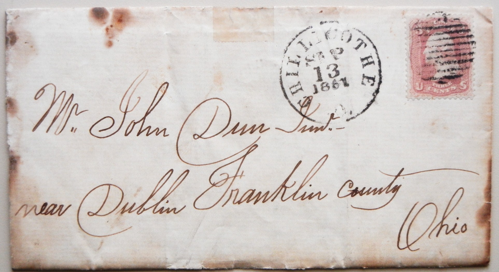 Prominent Chillicothe resident George William Dun writes to his son, John, to pass along to him the tenants he followed to get through life. The letter is written in light pencil, but is readable. An 1861 stamped folded letter is a late method of mailing a letter as by that time, most letters were sent in an envelope. Full Chillicothe Ohio postmark with grill cancel on stamp. Stamp is very well centered for the issue. Note that tape was used to reinforce a tear on a flap. The tape carries over to the front of the cover and can be seen just to the left of the postmark. There is also the mark left by a small piece of tape to cover a fold hole on the inside. Both were unnecessary. The letter is extremely poignant and reads: “Having spare time in hand this rainy day I thought I would write you on the subject of the best way of getting through this world, a most important subject. In doing this I will give you the plan I followed which has been almost exactly the same as that followed by Mr. Ross and Brother John and our cousins Hutchinsons and others that have done well in the world such as the Riskes & both old and young Mr. Alstons, etc. etc. Well to begin I paid nearly all my attention at all times to my own business and that of my own family and brothers and sisters and avoided nearly altogether the business of others. I talked about politics and voted but I never went any farther. I went to church but kept aloof from any kind of management. I kept clear of being a member of any kind of Society but if I had I would have kept aloof of any kind of management. Mr. Rockhill once offered to get me to be one of the directors of the one of the principal banks in Philadelphia but I told him that I gave all my time to my own business. Mr. Ross used to say that he attended to his business more than any storekeeper in Chillicothe do theirs and the consequence was his came out much better than that of any of them. I did the same in Philadelphia and our business is indeed better than that of any other importing house in Philadelphia. Farming needs as much thought & attention as any other business. To be sure many farmers make some kind of living out of farming without much thought but such men never go ahead any but keep quite stationary. As it were just standing still. To sum up in a few words. Avoid being at anytime anything of a public man but in the place of this keep all the time a domestic man. Every place has many examples of men who have been ruined by becoming public men but none that have been so by remaining domestic men.” It is signed GWD (for George William Dun). He added in a postscript: “My father gave me the same advice that I am giving you and I followed it.”