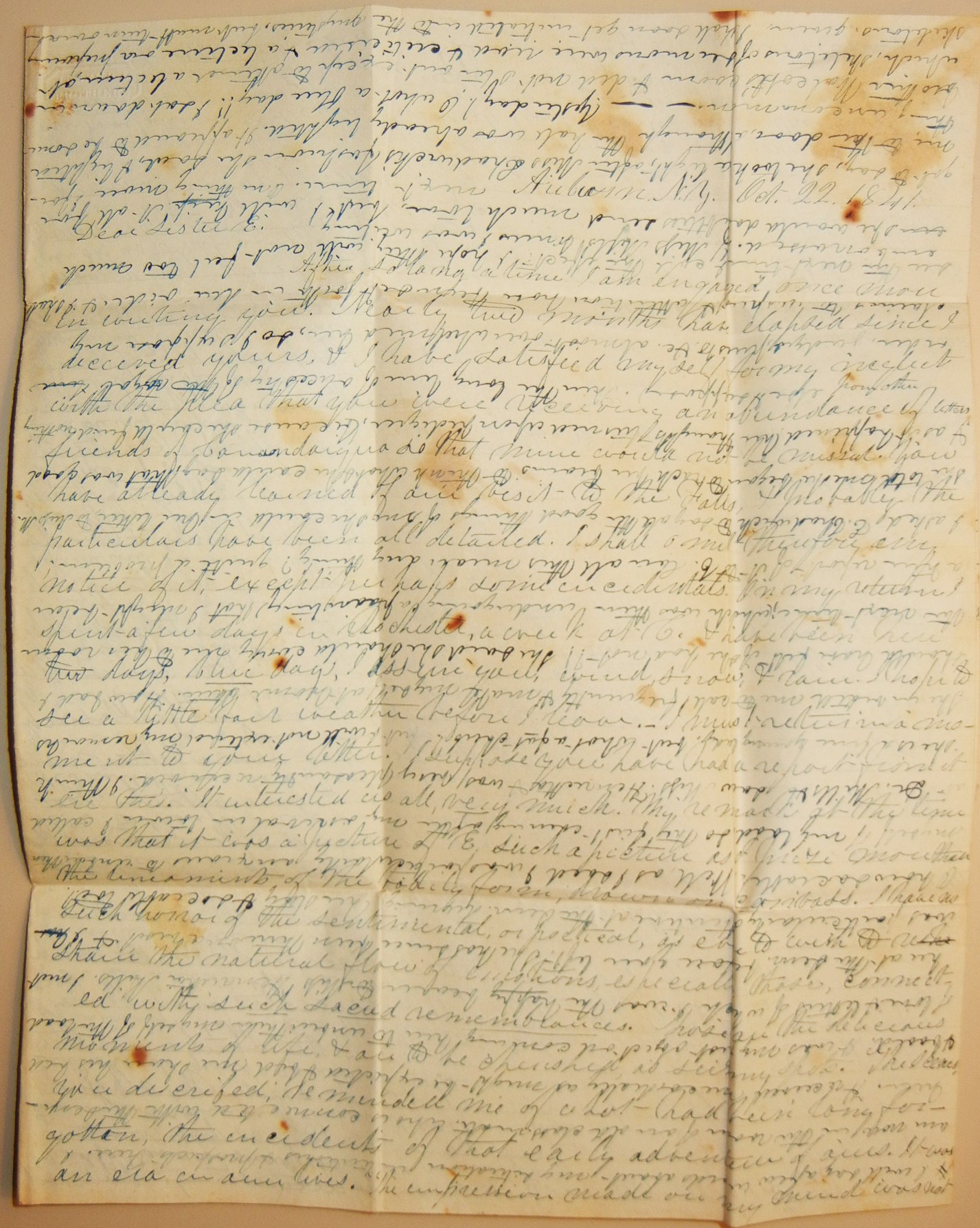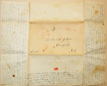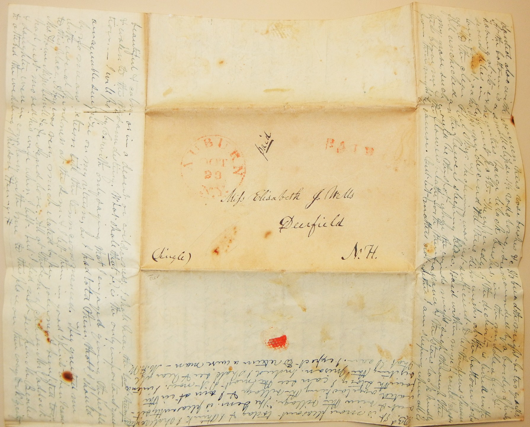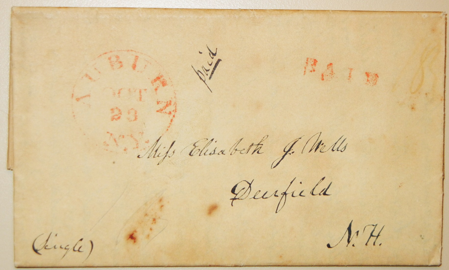 First stampless folded letter we have seen where the text is written horizontally from top to bottom and then the page is flipped and the text continues down the page between the original lines. Two pages written in this manner. While it looks impossible to read when you scan the page, it is surprisingly easy to read. M. H. Wells writes to his sister Elisabeth. Exceptionally long missive. Mostly general news, but lots of little comments including a visit to Dr. Mills where he "saw Miss Henrietta and was very pleasantly received. I think she is a fine young lady but what a fat chub. But I will not extend my remarks." Paper has some foxing and there is a small separation on page 3. Auburn postmark is complete but light. PAID is written by hand and also in red stamp. The double writing is what makes this letter truly extraordinary.