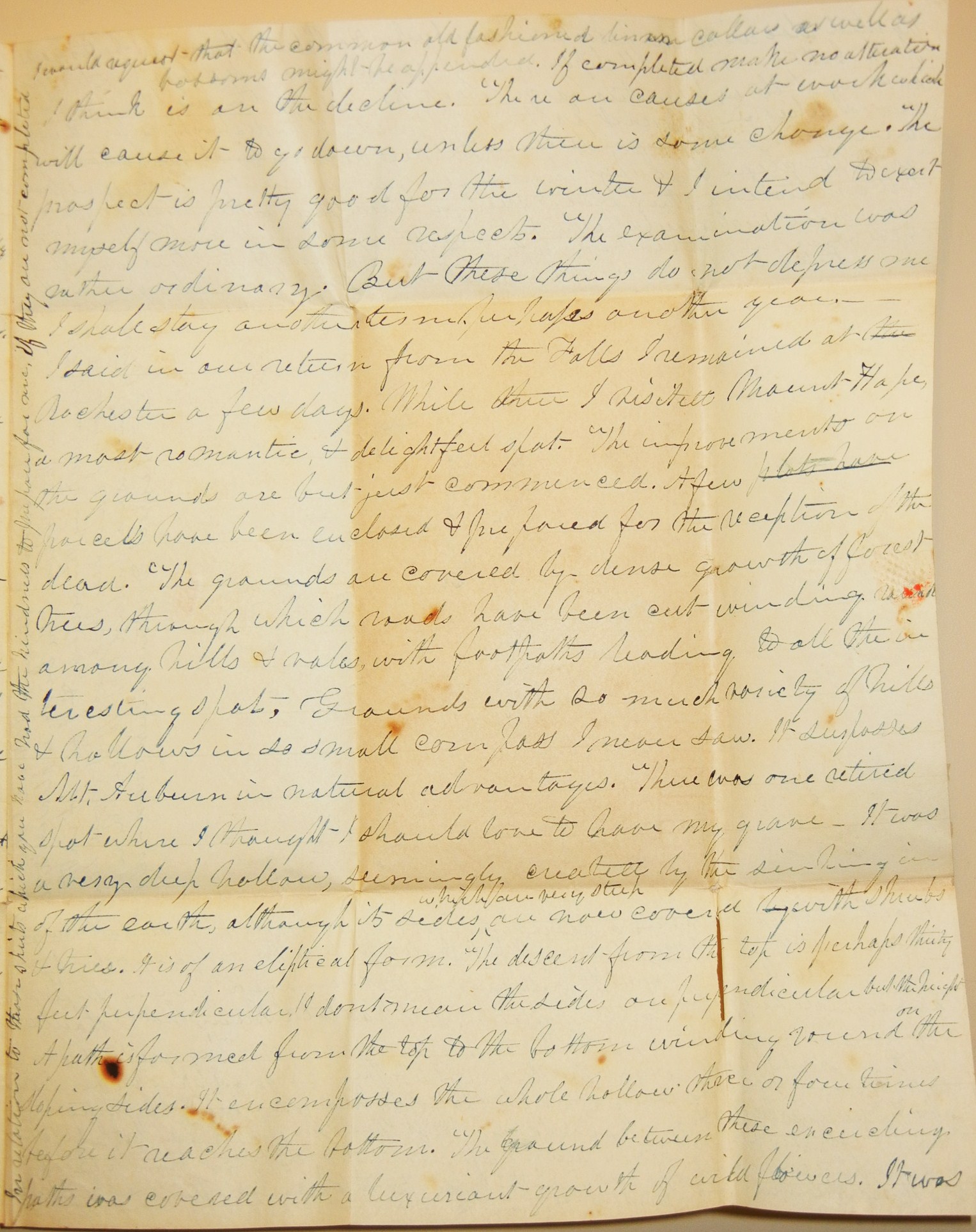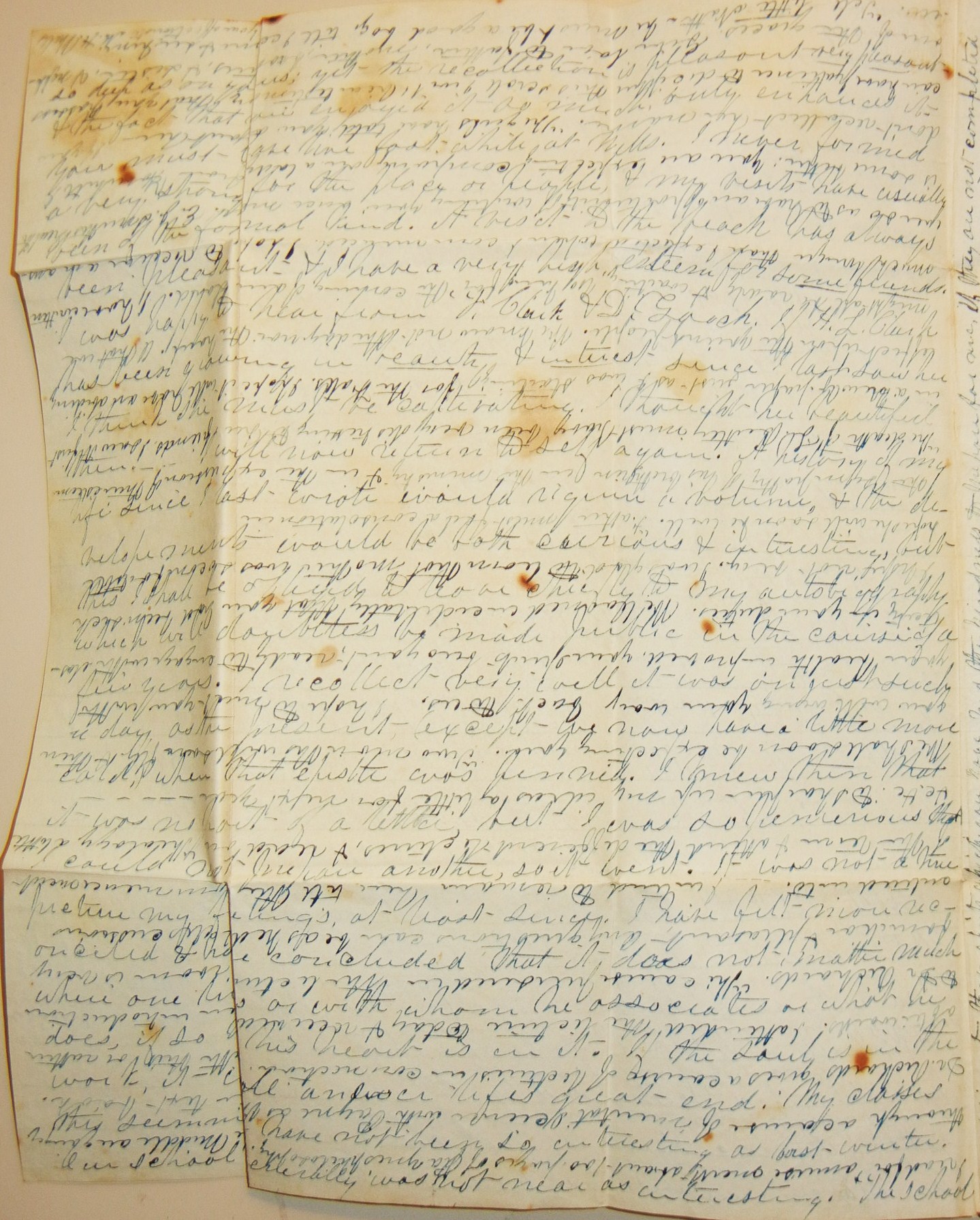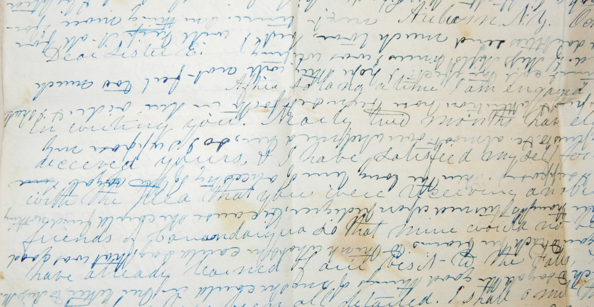 First stampless folded letter we have seen where the text is written horizontally from top to bottom and then the page is flipped and the text continues down the page between the original lines. Two pages written in this manner. While it looks impossible to read when you scan the page, it is surprisingly easy to read. M. H. Wells writes to his sister Elisabeth. Exceptionally long missive. Mostly general news, but lots of little comments including a visit to Dr. Mills where he "saw Miss Henrietta and was very pleasantly received. I think she is a fine young lady but what a fat chub. But I will not extend my remarks." Paper has some foxing and there is a small separation on page 3. Auburn postmark is complete but light. PAID is written by hand and also in red stamp. The double writing is what makes this letter truly extraordinary.