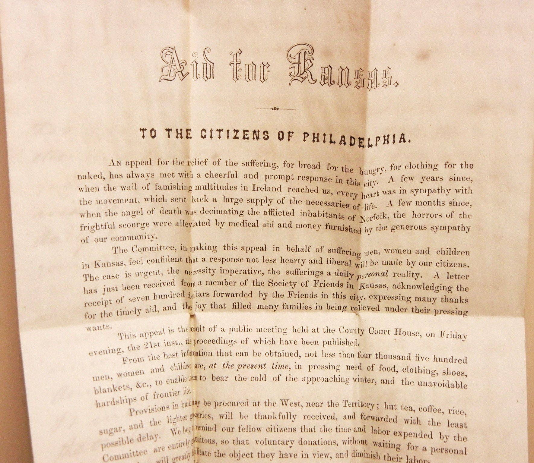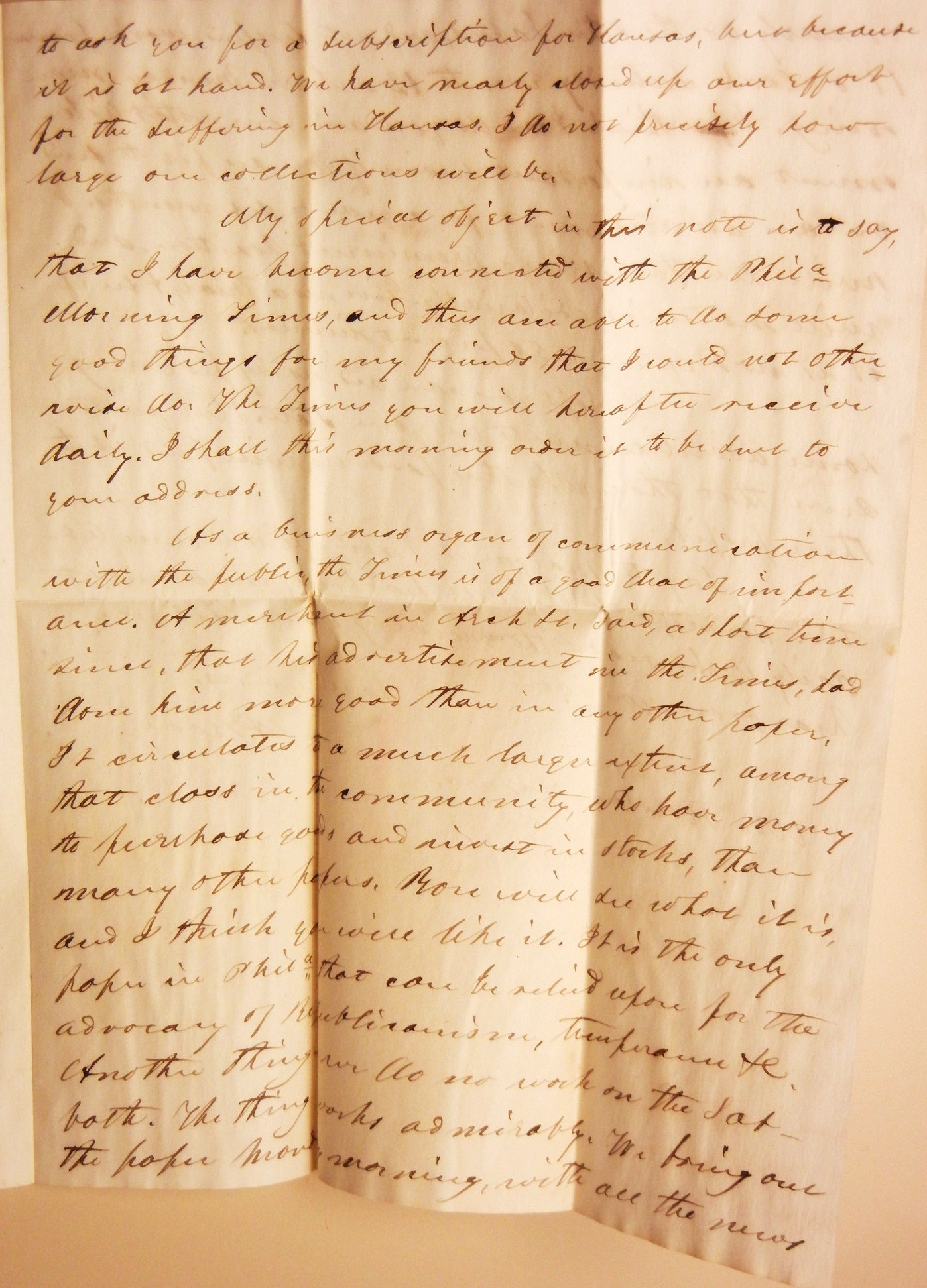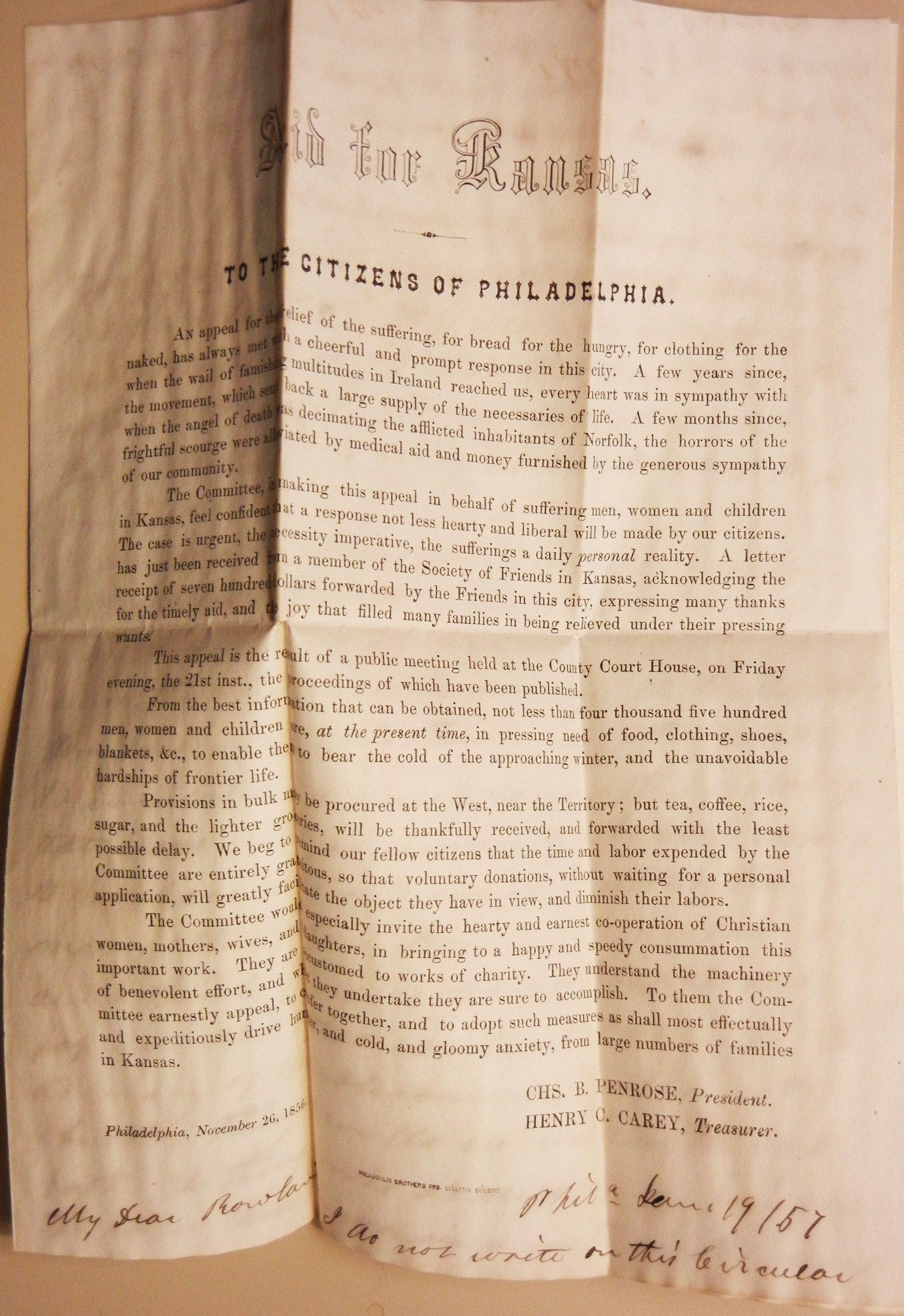 This is a fantastic 1857 letter and enclosure from the renowned Rev. Anson Rood to his future son-in-law, Rowland Hazard in Peacedale, Rhode Island. See bios below. First, the letter...Rood writes Hazard to inform him he has become affiliated with the Philadelphia Morning Times and is providing him with a daily subscription. He highly promotes the newspaper and ends his letter with a suggestion that Hazard place an advertisement in the paper. Second is the fact that he used a preprinted appeal from his church soliciting aid for Kansas; asking the citizens of Philadelphia to respond again with bread, clothing, etc., for "the suffering men, women and children in Kansas." The appeal is similar to the response "when the wail of famishing multitudes in Ireland reached us, every heart was in sympathy with the movement, which sent back a large supply of the necessaries of life." The bios below show that Rood was a pillar of his church and involved in raising funds and goods in response to catastrophic situations. Both the letter and the flyer it was written on are significant historical items.