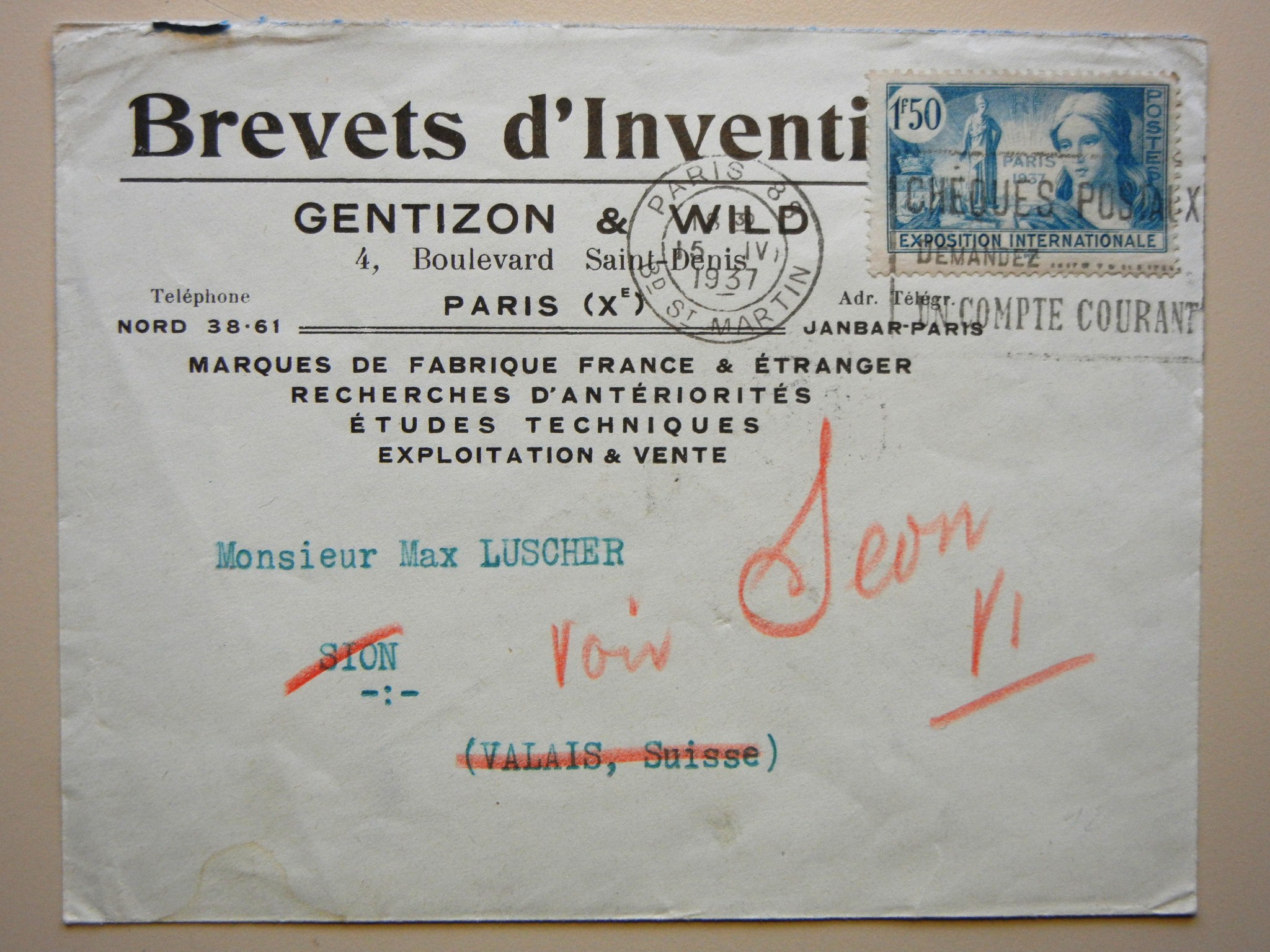 Paris, France, postmark on this Gentizon & Wild advertising cover to Switzerland. Scott 324 Exposition stamp.