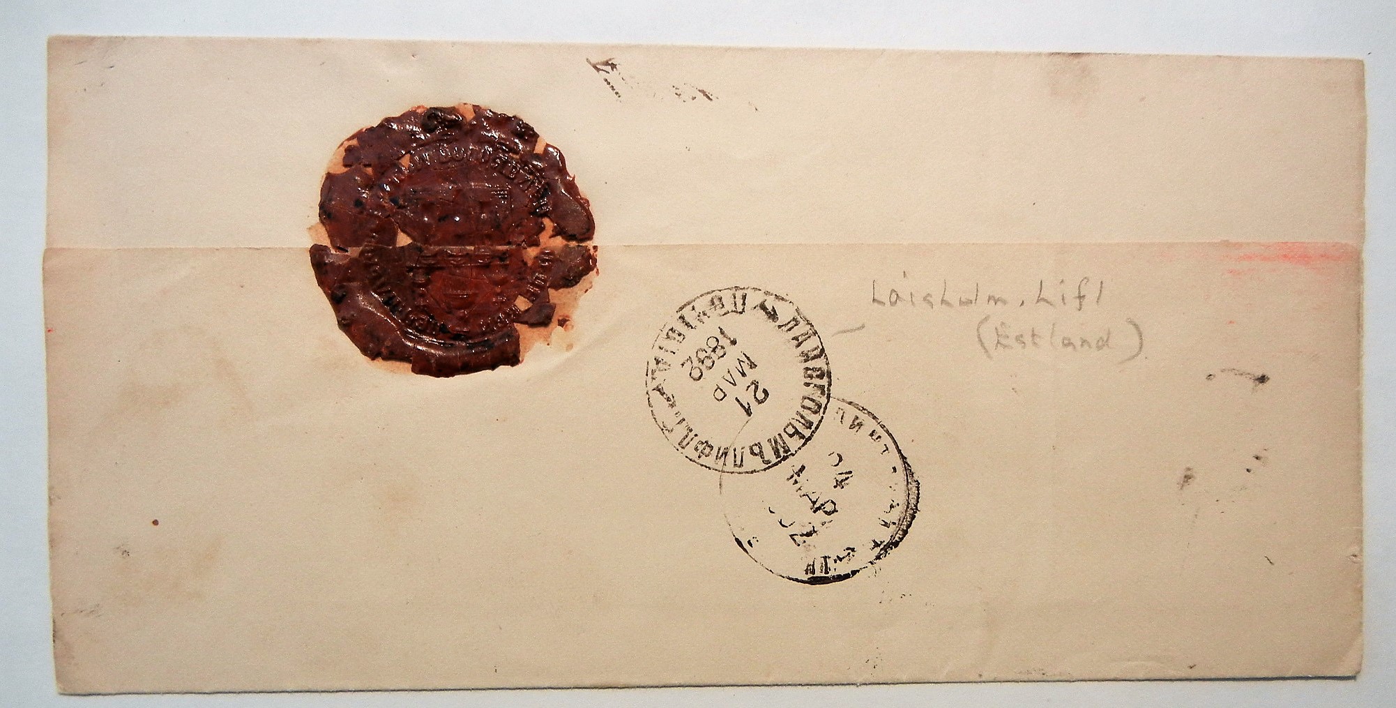 Postal markings are in cyrillic. Previous owner noted that the postmark on the reverse is Estland, an early name for Estonia. The cathedral in the seal does look like the central cathedral in Tallinn and the date falls in the time of Russian govenorate. Outstanding condition. Postmarks are sharp and full.