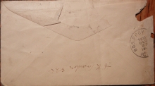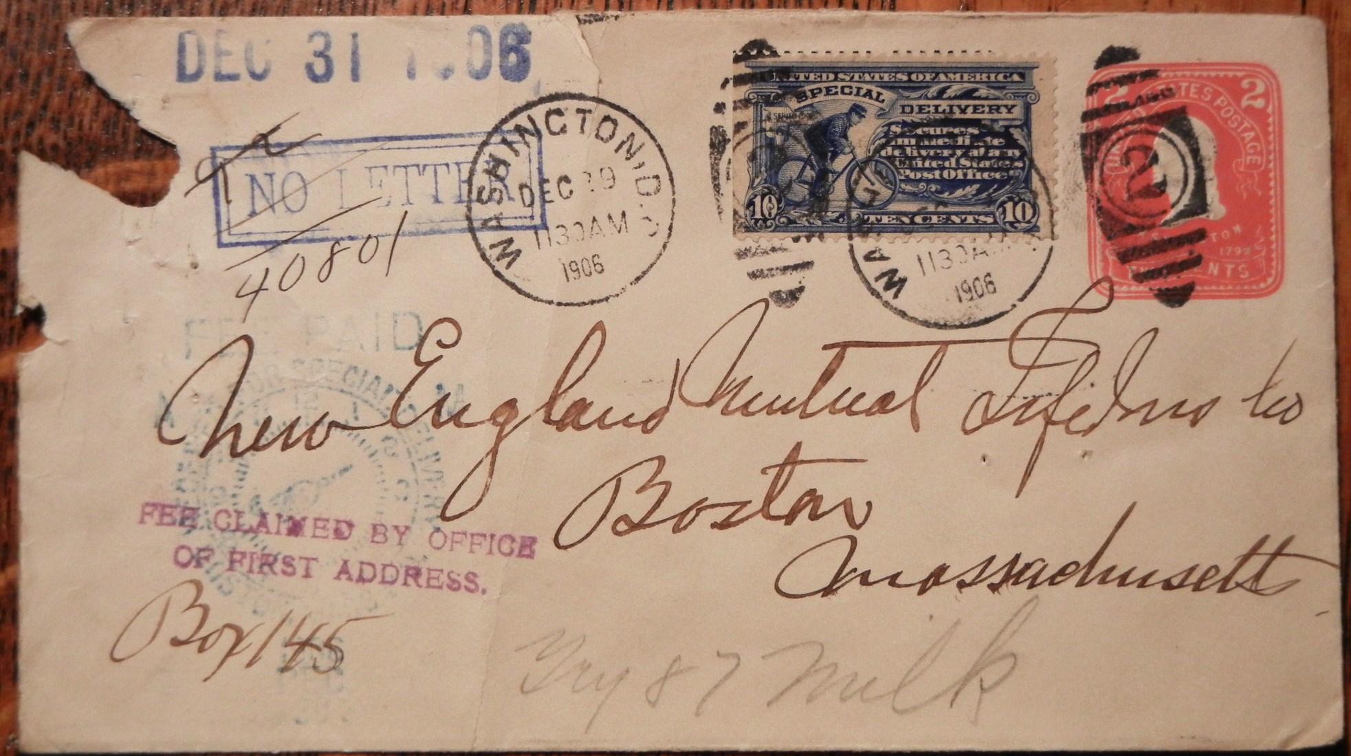 If you collect postal markings, special delivery or just very interesting covers...this lot is for you. Absolutely super postal history item. This 1906 Boston cover was sent special delivery from Washington DC to Boston MA. On the face it has these postal markings: large double-line box with No Letter; fee claimed by office of first address; and the best feature -- a fee paid Boston time clock receiver mark with the Boston capital building as the hour hand of the clock! Check it out in the lower left corner of the cover. The December 31, 1906 appears to be a receiver from the insurance company addressee. The back features a Boston and Providence Railroad Post Office partial postmark. As you see from the scan, the cover has damage at the upper left corner and a small hole just below that. Cover shows normal wear for a cover of this early vintage. Nice E-6 special delivery stamp along with postal stationery of the time