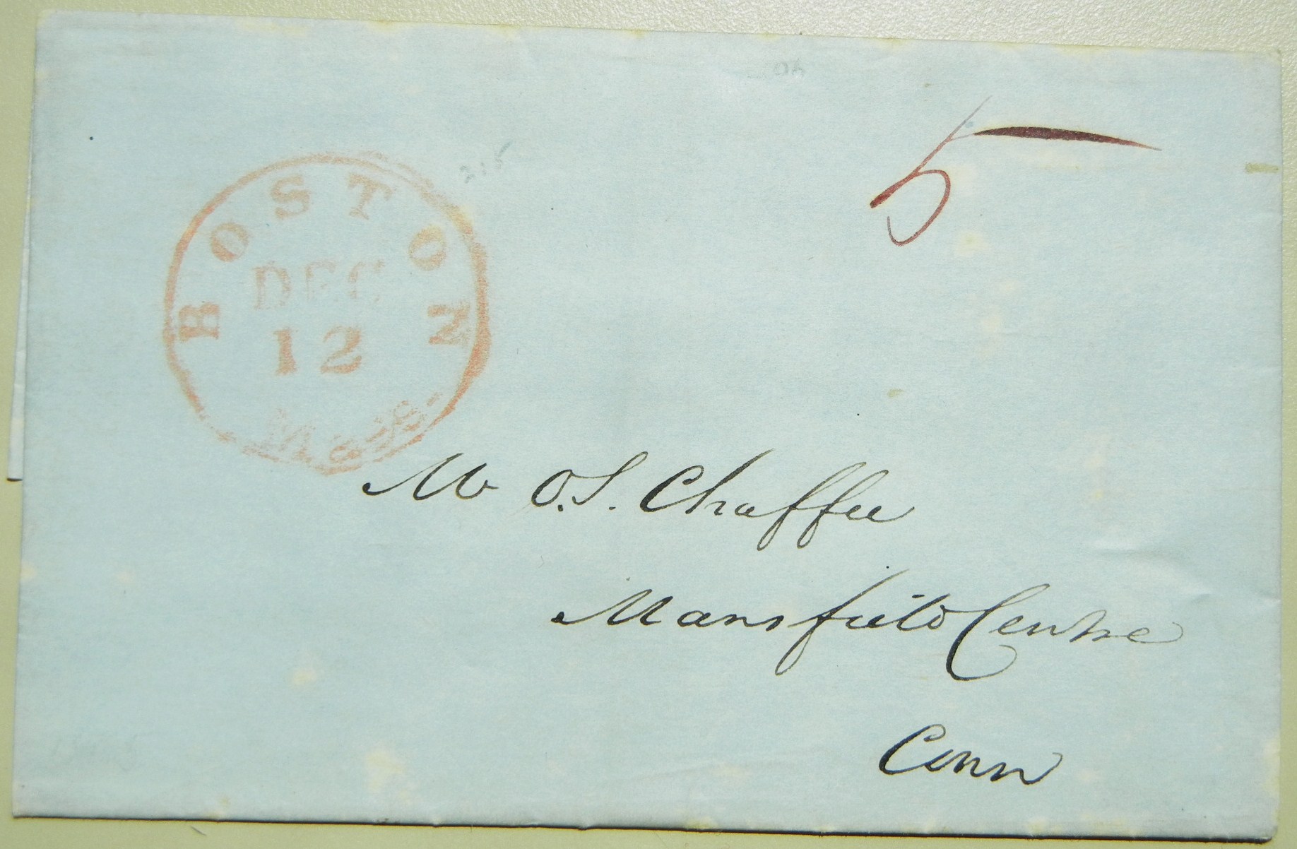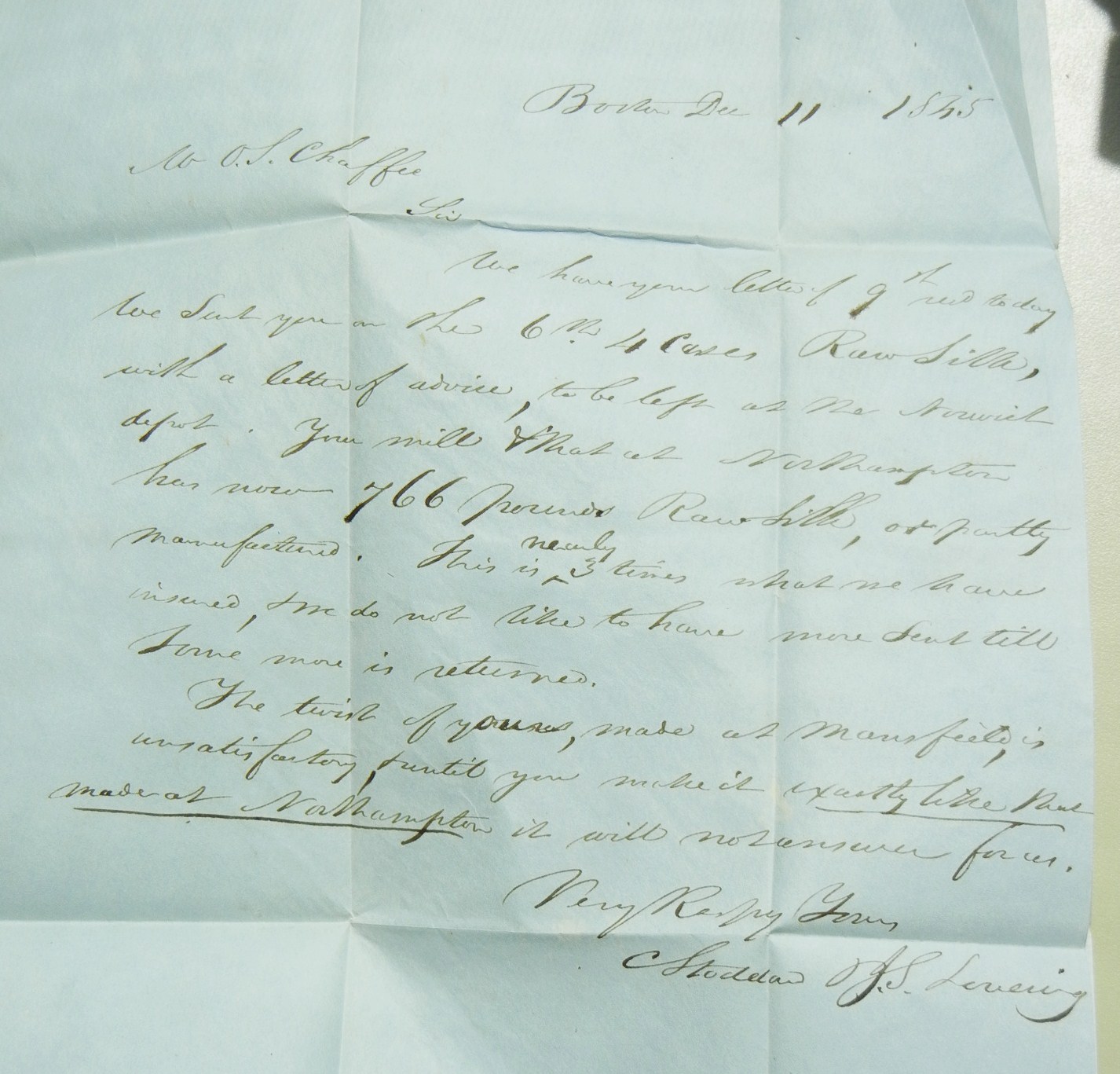 1845 stampless folded letter from C. Stoddard and J. S. Lovering to O. S. Chaffee in Mansfield Centre, Connecticut, informing him that four cases of raw silk will be delivered to the Norwich Depot for him along with a letter of advice. Apparently this silk is to be used to correct a problem with a previous order received in Boston that was unsatisfactory: “The twist of yours, made at Mansfield, is unsatisfactory. Until you make it exactly like that made at Northampton it will not answer for us.”
