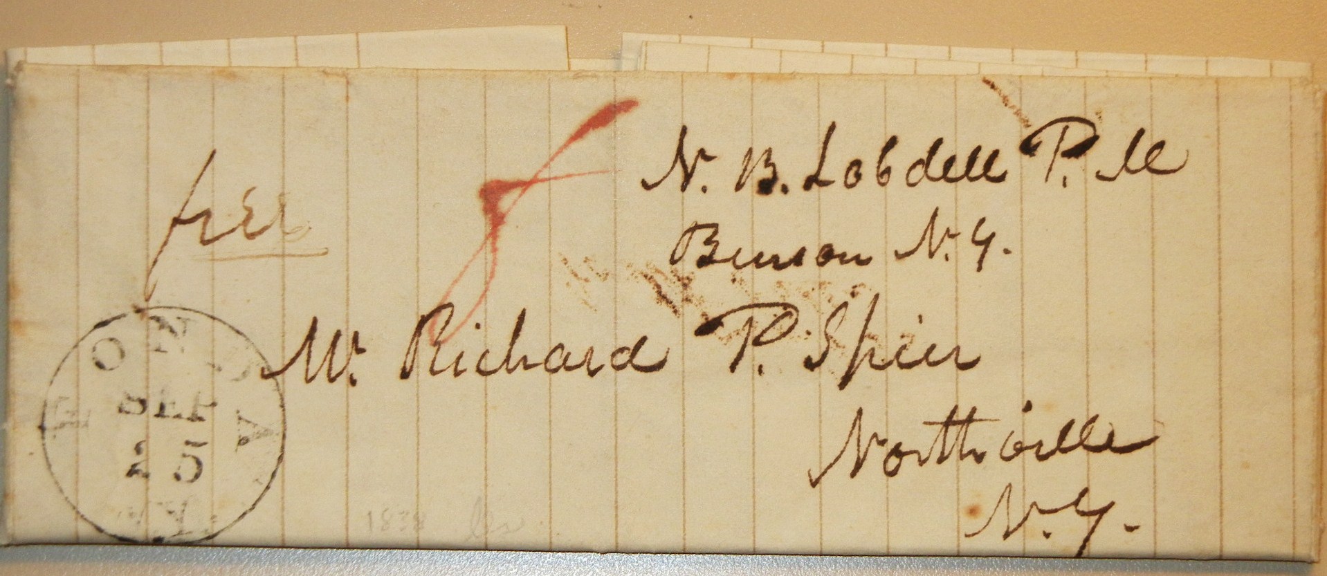 Benson New York postmaster N.B. Lobdell sent this letter free with his franking. Letter is postmarked Fonda, NY, as well. Letter is from Lobdell. He wants to know if Richard Spier is going to visit or not. There is also a manuscript 8 rate mark on this letter. Further investigation needed as to franking, postmark and rate mark. Condition very good.
