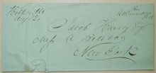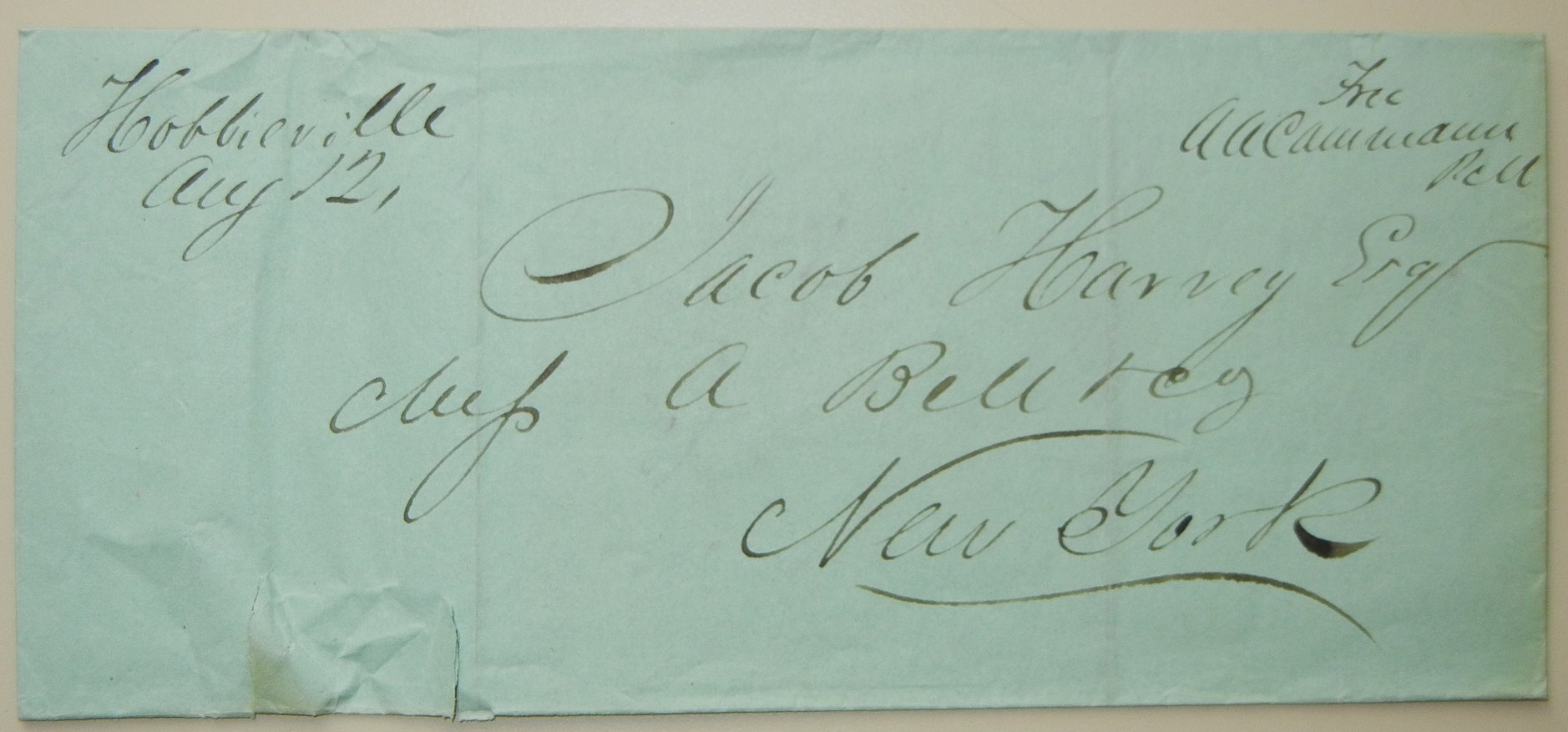 Hard to find manuscript stampless folded letter. Brief letter mentions that sender's brother is busy trying to get a shepherd dog from Scotland. Also mentions cotton business, and quoting prices for land. Writer was the postmaster of Hobbieville at the time, thus postage was FREE. See scan for slight wrinkles at left and also two slices into green paper stock at lower left. Hobbieville is an unincorporated town in Center Township, Greene County, Indiana.