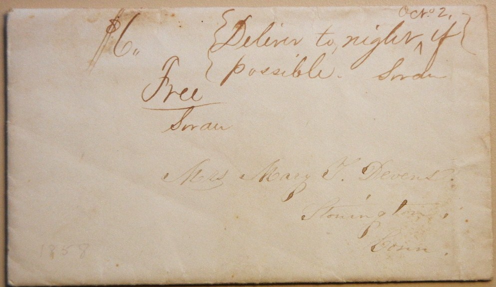 No postal markings on this envelope. There is a notation in upper right corner: Deliver tonight Oct. 2 if possible. It is also marked Free. Note is from Lizzie to Mary. Contents concern a button business Lizzie is helping Charles with and some other social news...nothing that one would seem couldn't wait until morning.