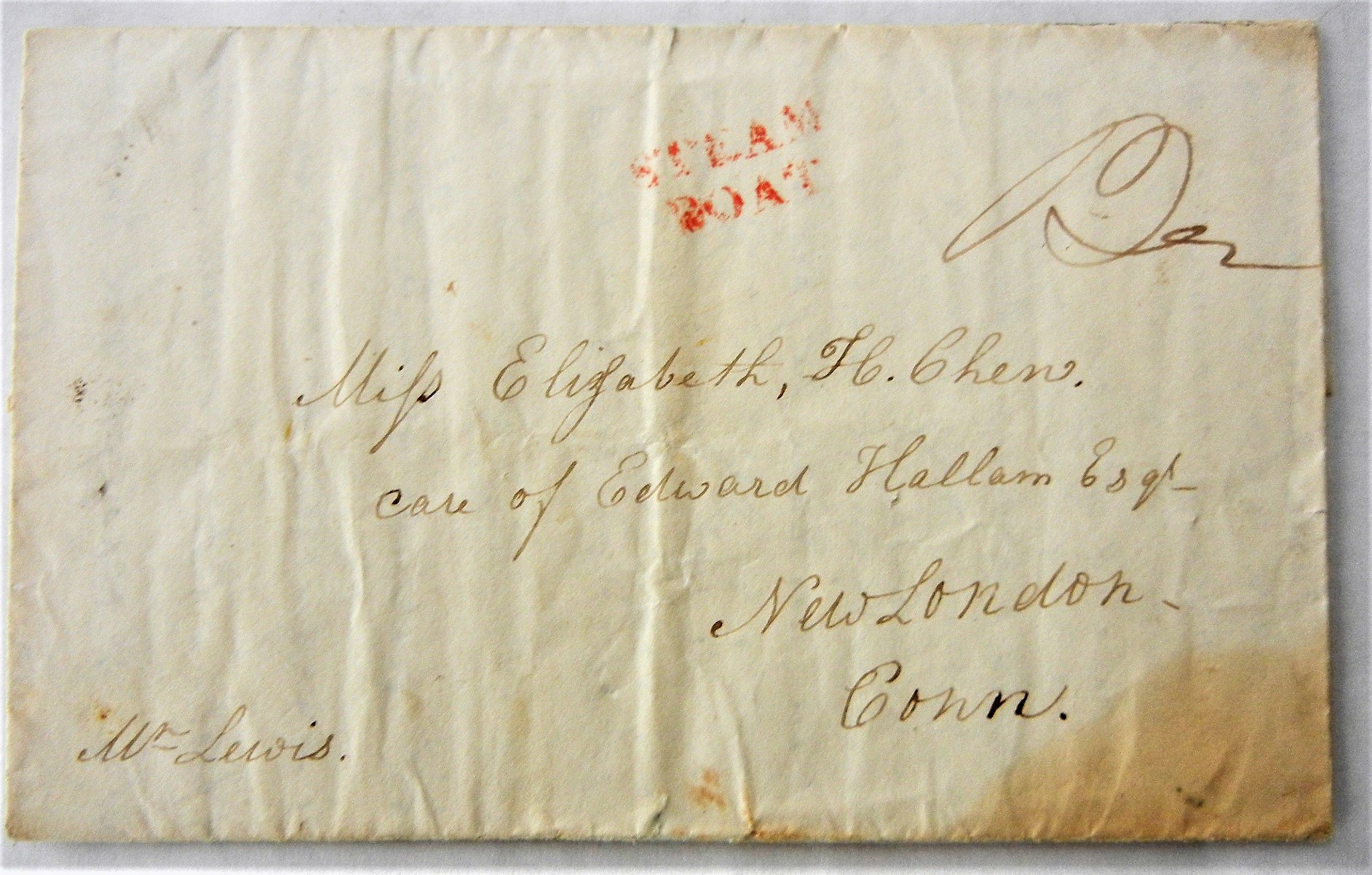 Letter to Elisabeth Chen from her sister telling her of family events. Includes mention that he has given Elisabeth's address to a male friend who will be visiting New London and "I hope you haven't eloped". Correct 12.5-ct rate for steam boat transport. Letter has been expertly repaired; closing tears at folds.