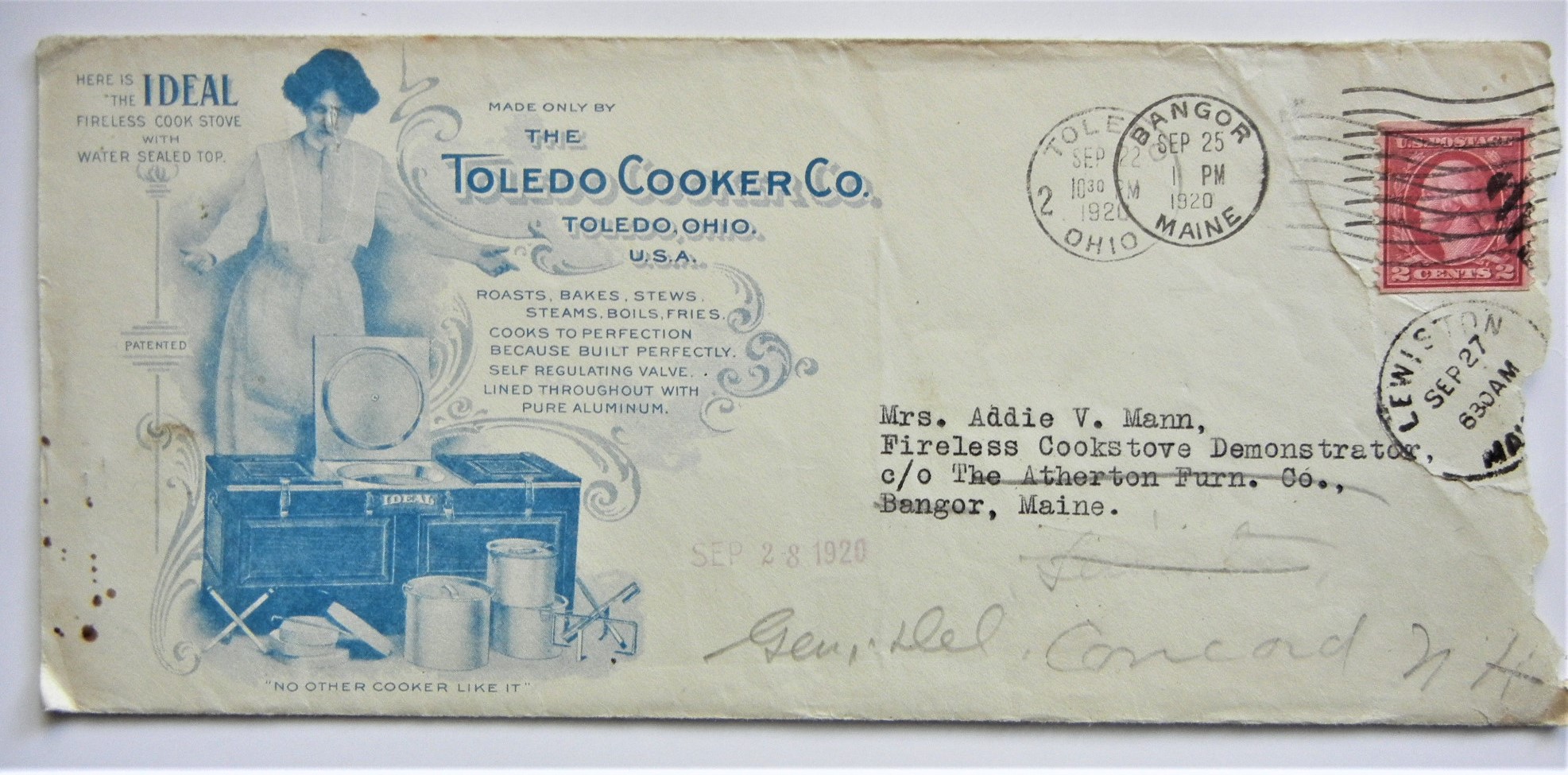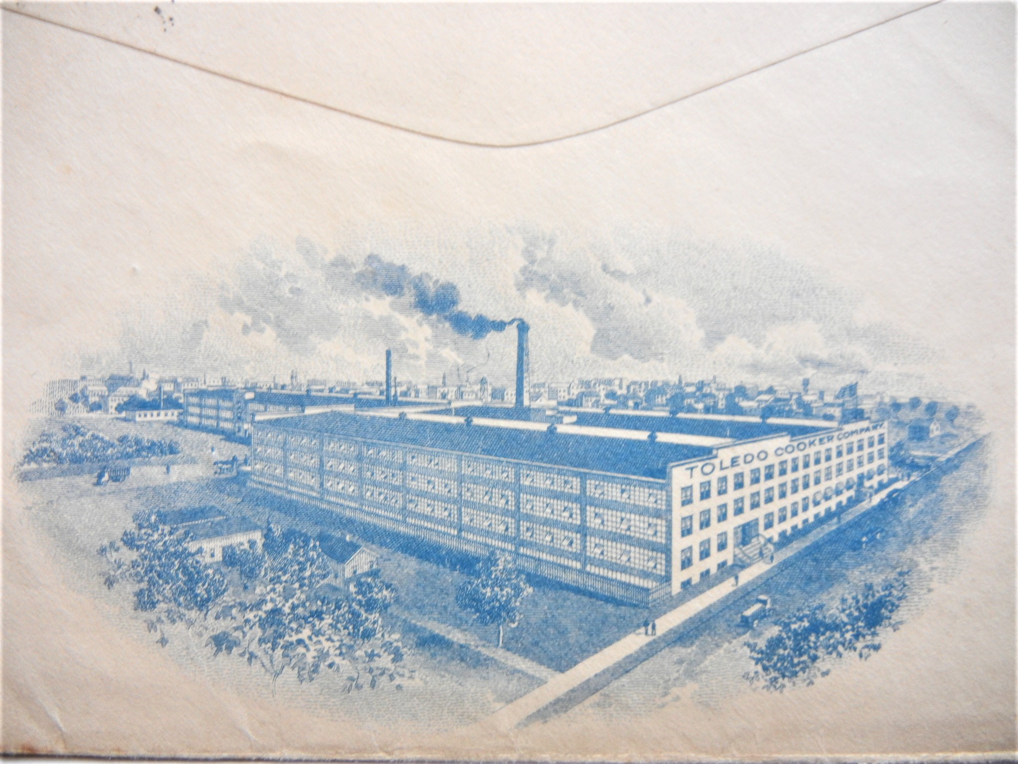 Two advertising covers with attractive artwork. Both covers have some damage. Both have blue rendering of the Cooker factory on the back. Also included is a bill head for the company.