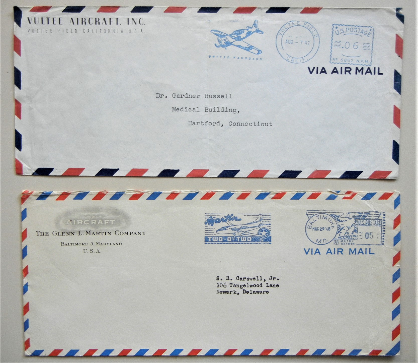 Vultee cover is scarce and has nice airplane vignette in 1942 meter mark. Glenn Martin cover is 1948 with 202 aircraft vignette in meter mark. Both business-size covers in very clean condition.