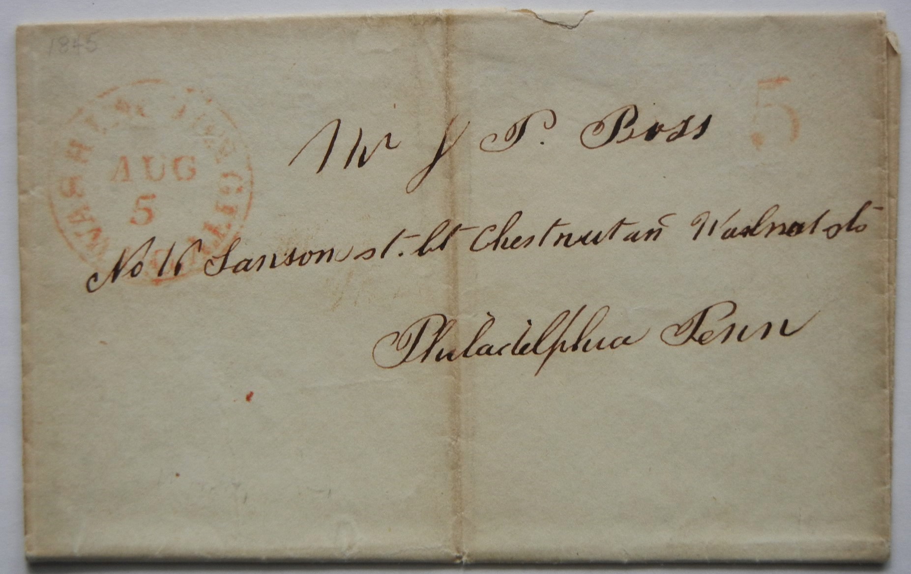 Light but clear red postmark and numeral 5 rate. No content. SFL was folded down middle. Average condition.