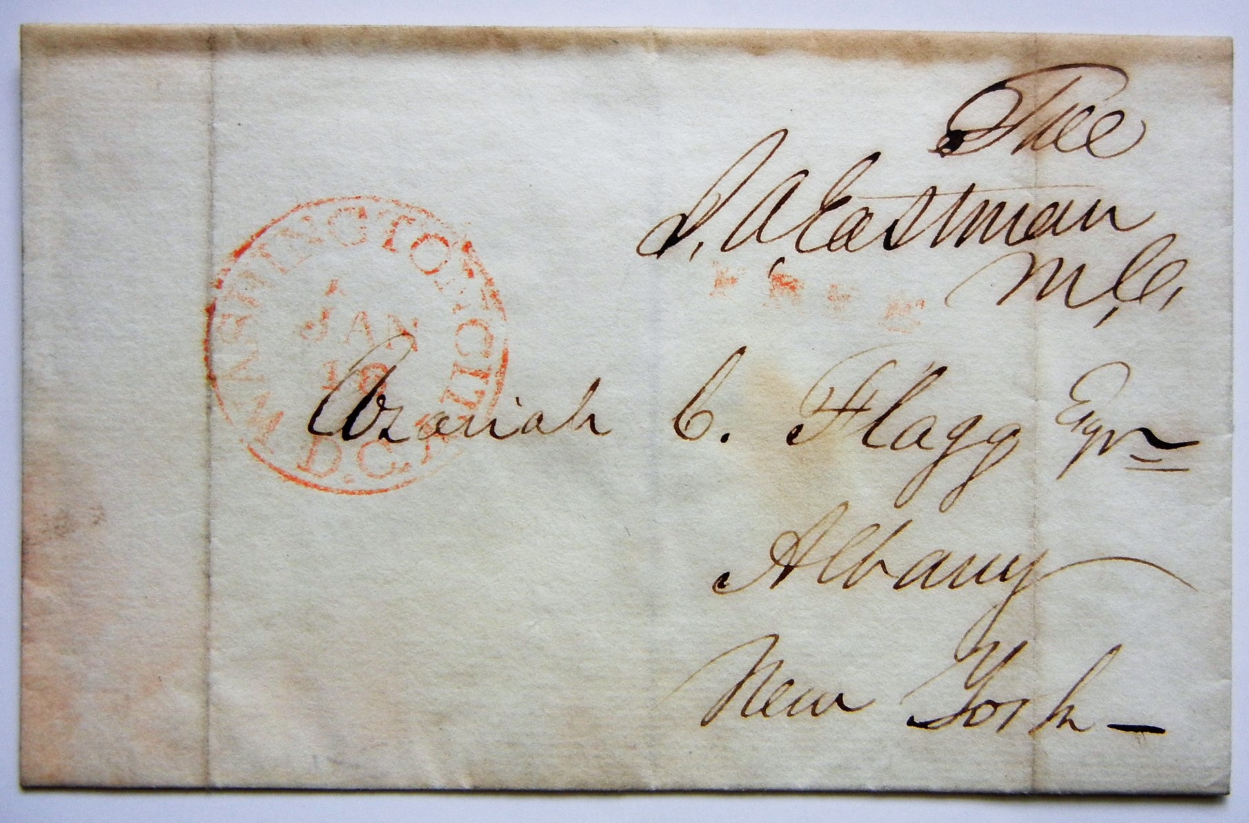 Light, but full, Washington City January 18 postmark. Stampless folded letter is in very nice condition. No content. Recipient noted date of 1843. Ira Allen Eastman (January 1, 1809 – March 21, 1881) was an American manufacturer and Democratic politician in New Hampshire. He served as a member of the United States House of Representatives and as a member of the New Hampshire House of Representatives in the 1800s. He was born in Gilmanton, NH. He attended local schools and Gilmanton Academy before graduating from Dartmouth College in Hanover in 1829. He was admitted to the bar in 1832; practicing law in Troy, NH. Eastman returned to Gilmanton in 1834 and continued the practice of law. He served as clerk of the New Hampshire House of Representatives in 1835. He was as member of the State House of Representatives from 1836-1838, and served as speaker of the State House in 1837 and 1838. He was Register of Probate for Strafford County from 1836 to 1839. Eastman was elected to the 26th and 27th Congresses, serving from March 4, 1839 - March 3, 1843. He served as chairman of the US House Committee on Revisal and Unfinished Business during the 27th Congress. After leaving Congress, he served as judge of the NH Court of Common Pleas (1844-1849). He was associate justice of the NH Supreme Court from 1849-1855, and as justice of the NH Supreme Court from 1855-1859. In 1858, he was honored with a L.L.D. degree from Dartmouth College, and in 1859 he was chosen trustee of Dartmouth. After resigning from judicial service, Eastman resumed the practice of law in Concord and Manchester. Eastman was an unsuccessful candidate for Governor of New Hampshire in 1863 and for US Senator in 1866. Eastman was married to Jane Quackenbush and they had two children, Clarence and Anna Q. He was the nephew of Nehemiah Eastman, a United States Representative from New Hampshire.