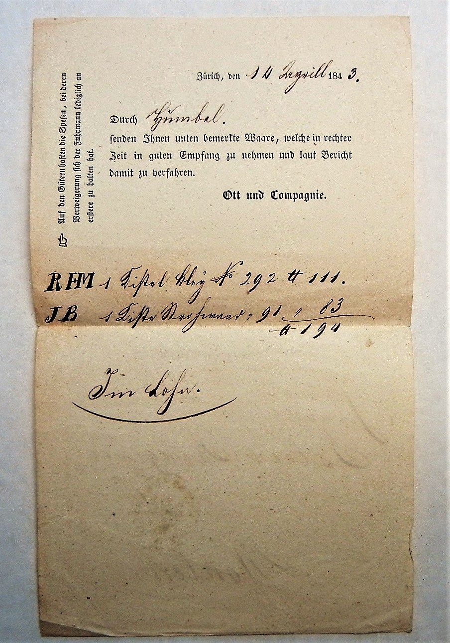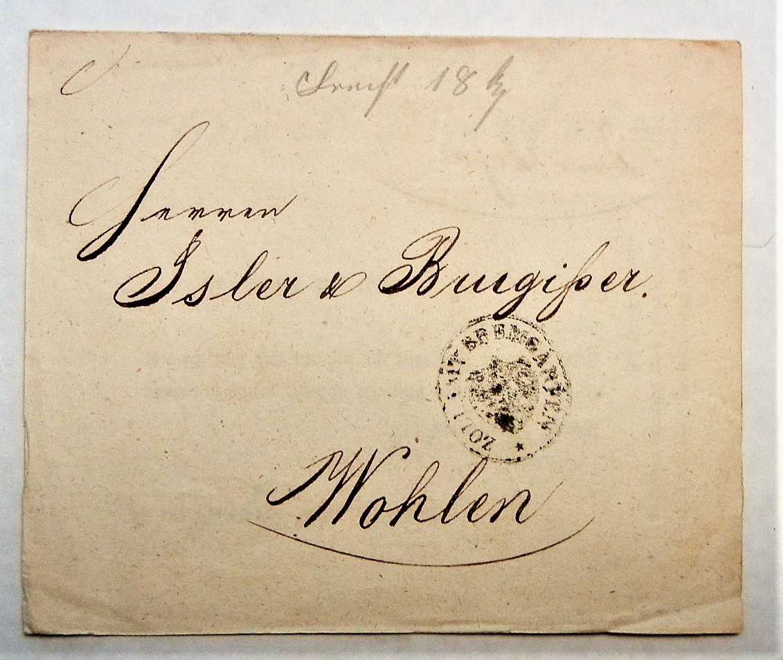 Oval customs inspection mark on this document from Zurich to Wohlen.